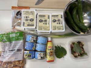 白ごま、木綿豆腐、キュウリ、鯖缶、すりおろしショウガ、青葉、ミョウガ。