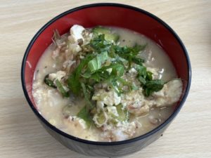 冷たい味噌ベースの汁をご飯などにかけて食べる「汁かけご飯」です。味噌・焼き魚・ごまをすり鉢で混ぜて香ばしく焼き、冷たいだし汁でのばし、きゅうり・豆腐・みょうが・大葉などの薬味を加えて、冷えた汁をご飯にかけるとのことです。