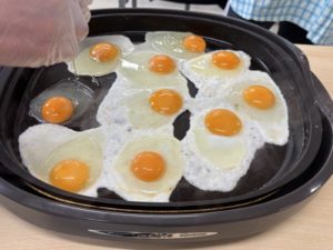 大きなホットプレート2台で2回戦、ホットプレートからあふれんばかりの材料を混ぜ合わせるのが大変そうでした。