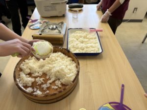 炊き上がったお米は飯台で酢と合わせ、うちわであおぐ人、混ぜる人と自然に声を掛け合いながら酢飯を完成させてくれました。