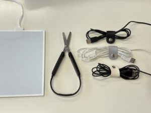 ミニホワイトボード、握りがもどるハサミ、コードをまとめるバンド、です。